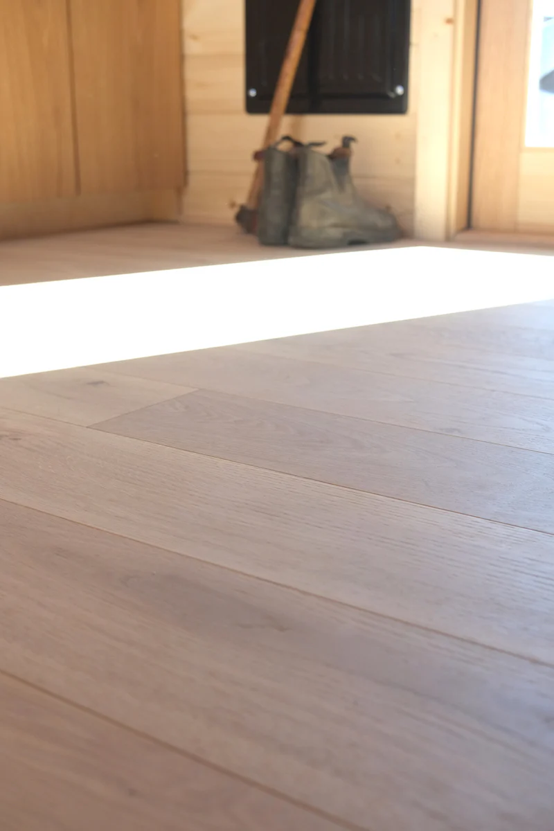 Named after prolific Swedish children’s author Astrid Lindgren, this white oak hardwood floor is the product of Scandinavian cleverness and curiosity. Astrid’s light color is complemented by an ultra-matte acrylic finish that looks and feels similar to raw wood while protecting the floor from daily life. Like its sister floor Greta, Astrid can have color variation from board to board, including red-toned and darker boards in addition to some knots.